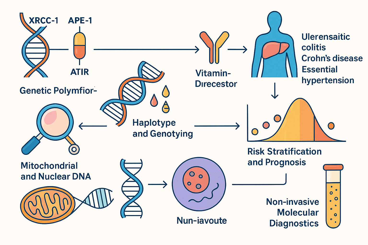 CLRD identifies genetic polymorphisms (XRCC-1, APE-1, AT1R, Vitamin D receptor) linked to liver and GI disorders. Advanced haplotype and genotyping protocols aid risk assessment, while mitochondrial and nuclear DNA quantification enables non-invasive diagnostics in liver failure.