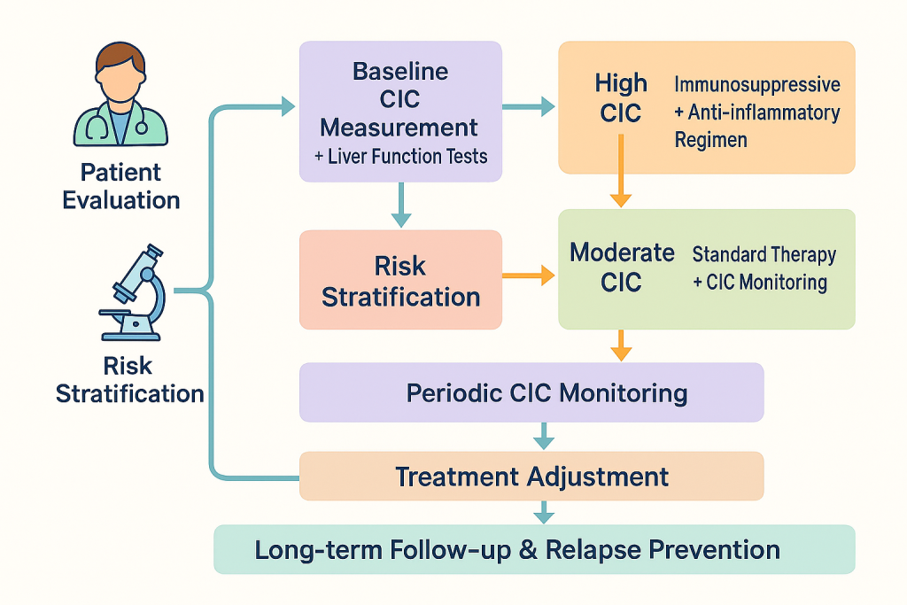 The treatment pathway at CLRD begins with a comprehensive patient evaluation that includes clinical assessment and baseline laboratory investigations. Once the initial evaluation is complete, CIC measurement is performed alongside liver function tests to establish an immunological and biochemical profile. Based on these findings, patients are stratified into risk categories that determine the intensity of therapy. Individuals with markedly elevated CIC levels are started on aggressive immunosuppressive and anti-inflammatory regimens to control immune-mediated tissue damage, while those with moderate CIC concentrations receive standard therapy supplemented by close monitoring to prevent disease escalation. Throughout the treatment course, CIC levels are periodically reassessed to evaluate therapeutic response and guide adjustments in medication dosage or regimen. This dynamic monitoring ensures that therapy remains aligned with the patient’s immunological status, reducing the risk of relapse and minimizing unnecessary exposure to potent drugs. The pathway concludes with long-term follow-up, where CIC trends are integrated into predictive models for relapse prevention and sustained disease control.