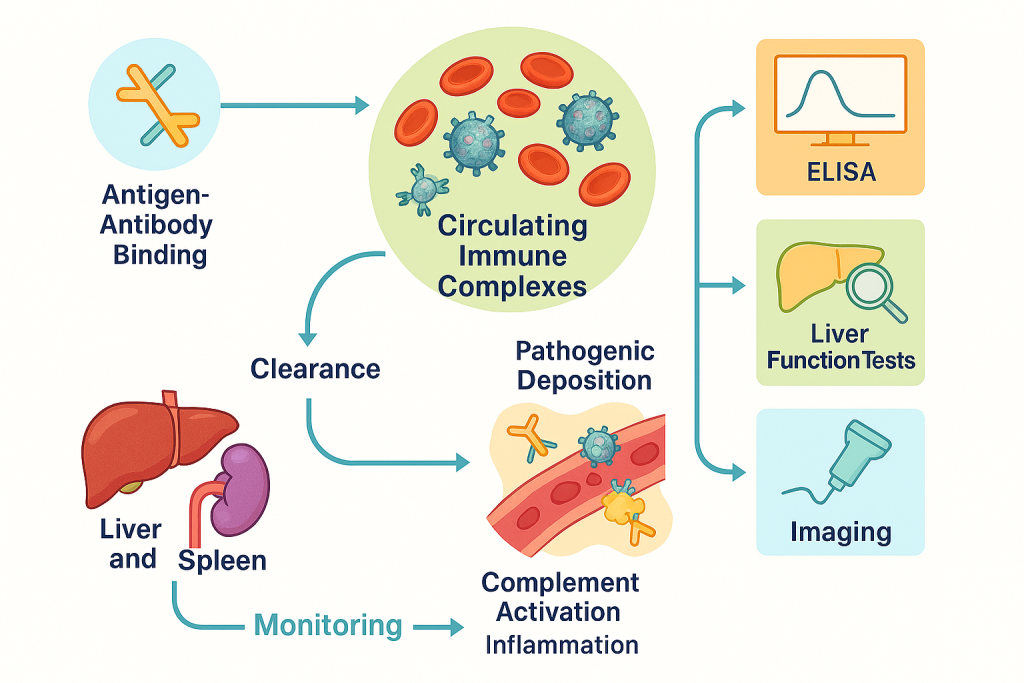 CICs play a critical role in immune-mediated diseases. Their deposition in vascular endothelium, renal glomeruli, or hepatic tissue initiates local inflammation through complement fixation and recruitment of neutrophils. This process leads to tissue injury, fibrosis, and progressive organ dysfunction. In autoimmune liver diseases, CICs correlate with hepatocellular damage and immune-driven fibrosis, while in peptic ulcer disease, they contribute to mucosal immune dysregulation and chronic ulceration.
